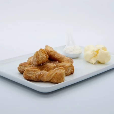 Para la elaboración de los Lazos de hojaldre, se estira el hojaldre previamente laminado sobre una capa de azúcar. Se reparte bien sobre toda la lámina. Posteriormente, se cortan uno a uno y se les da forma.